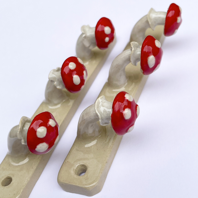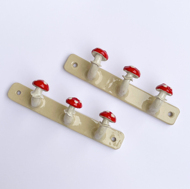 A hook rail with three charming toadstool hooks. Mounted using screws. Screws not included.