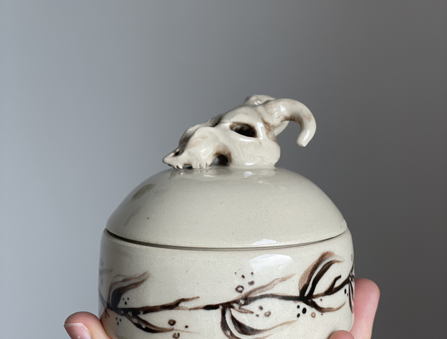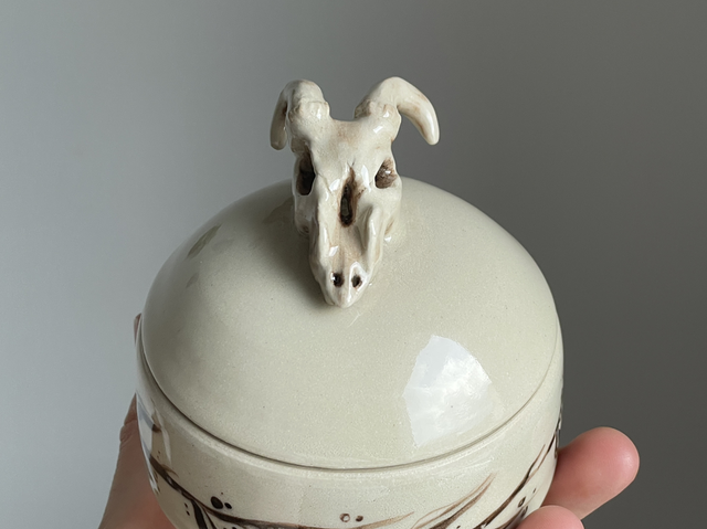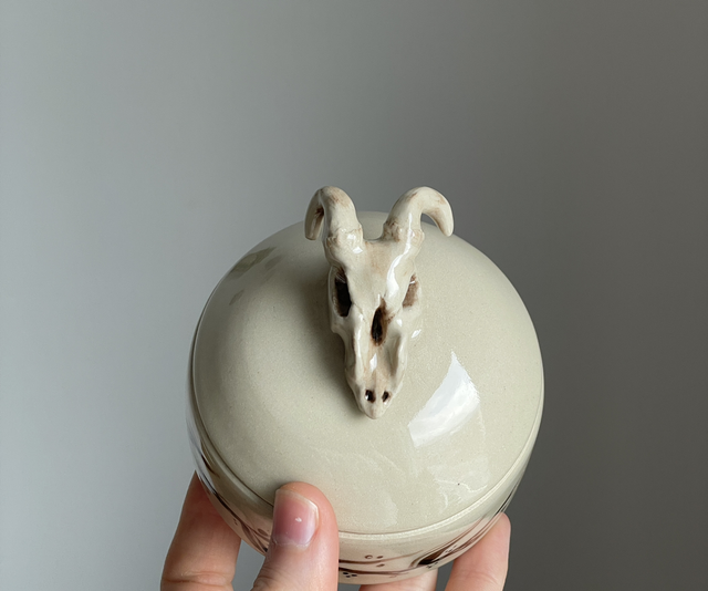 En burk i stegods, handmålad och dekorerad med en skulpturerat getskalle